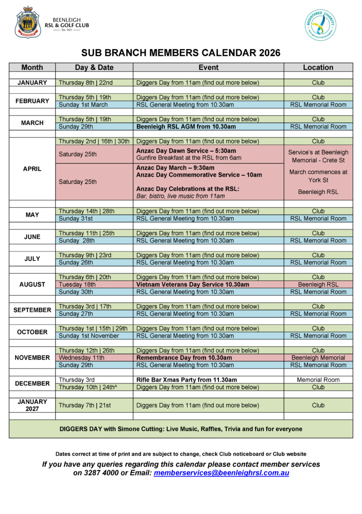 Click here to view a PDF of the Beenleigh & District RSL Calendar for 2026.